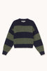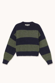 Knitted from a soft, cozy mohair blend, this sweater features a round neck and voluminous sleeves for a softly structured winter silhouette. Designed with oversized stripes in navy and khaki. Fully fashioned for a clean, considered finish.