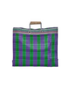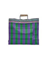 Add a splash of colour to your day with this vibrant purple tote bag. Crafted from recycled polypropylene, its robust design makes it a practical choice for daily errands. The striking green and purple checkered pattern, complemented by a striped band at the top, captures attention effortlessly. Bamboo handles offer a comfortable, natural grip while adding an elegant touch. The metal accents ensure extra durability for carrying essentials. Ideal for summer, this eye-catching tote blends style with functionality for your wardrobe.