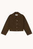 Striped denim jacket. Unlined, crafted in striped denim with a deep navy base and brown stripes. Features a statement collar, silver metal buttons, front welt pockets, and a back yoke. Designed for a sharp, modern silhouette. Pair with matching denim for a cohesive look.